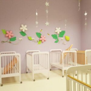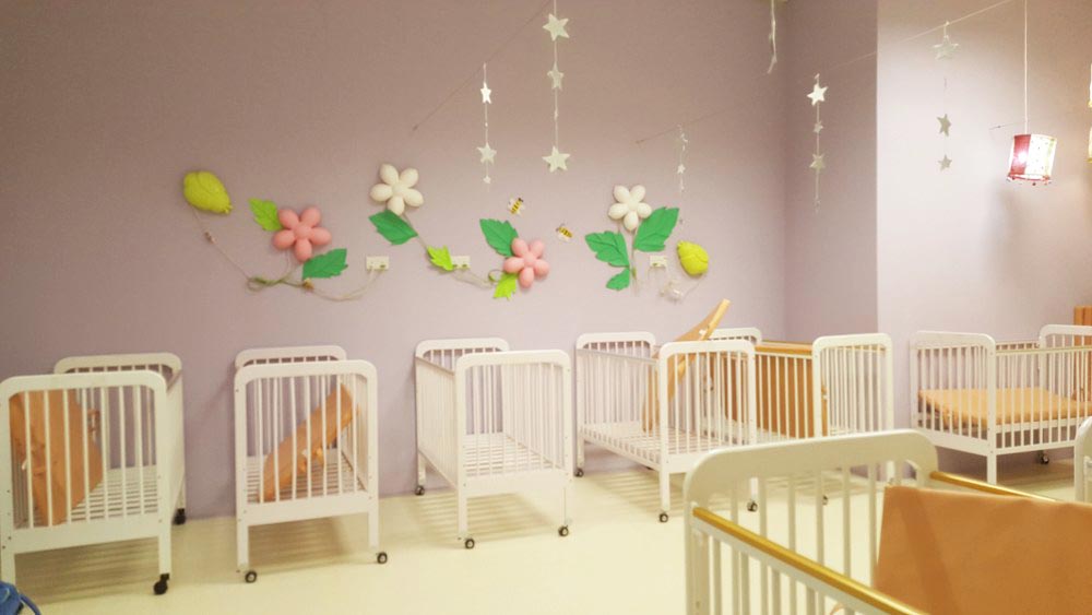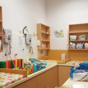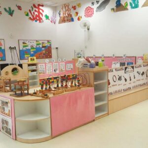 Everywhere in the kindergarten, a mingling of learning materials and cleverly disguised playthings would facilitate passive and reinforcement learning. There was enough space to include two dedicated play areas; each was lined with non-abrasive, impact-absorbing mats and closed off with matching safe fences and the nursery closets so that diapers and other baby needs are always at hand.